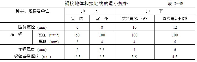3.2.1人工接地體(極)的最小尺寸見表3-48所示。