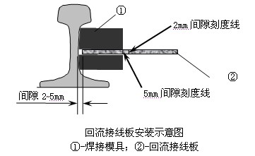 ①焊接前先確定回流接線板的焊接位置,一般情況下,回流接線板需焊接在兩軌枕之間的走行軌腰部,同時做向下彎曲,避免與其他設備碰撞,兩接線板間距1850mm。